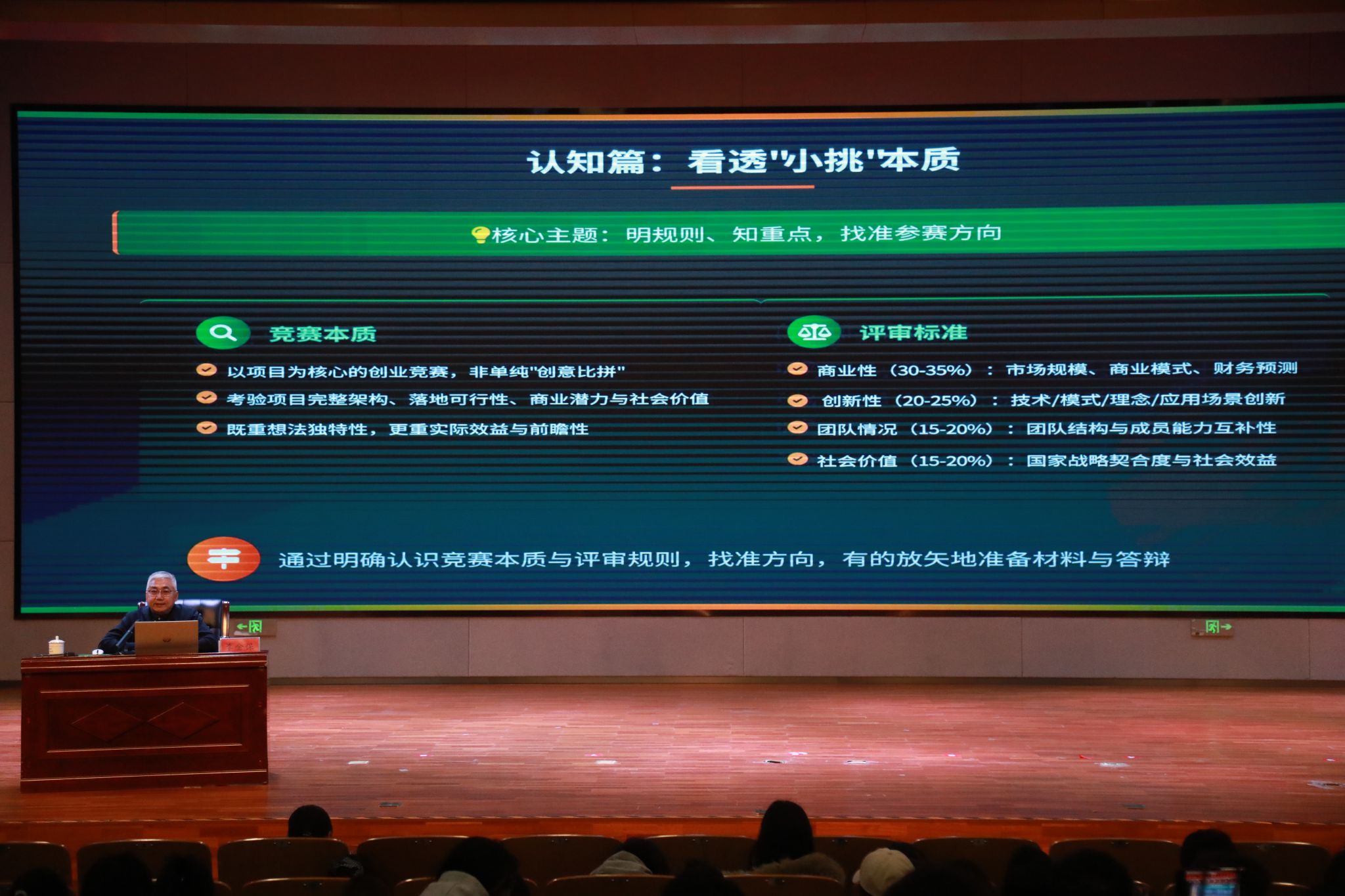 在仪式第二阶段,中南大学人力资源研究中心副研究员王华教授、“挑战杯”国赛评委李金保教授为师生们带来了“名师·名家面对面”专题讲座。王华以《创赛制胜,高质量项目挖掘与团队打造》为题分享,结合职业经历从项目价值、挖掘、展示及团队打造四大板块展开。并围绕竞赛答辩、科研转化及产学研合作等方面分享实操经验,为师生创新创业提供切实指引。李金保以《2026挑战杯创业计划竞赛参赛通关指南》为题,从认知竞赛本质、组建优质团队、挖掘特色项目、打磨申报材料等六大维度系统展开,解析了竞赛核心规则与评审标准,为广大同学提供了系统备赛指引。