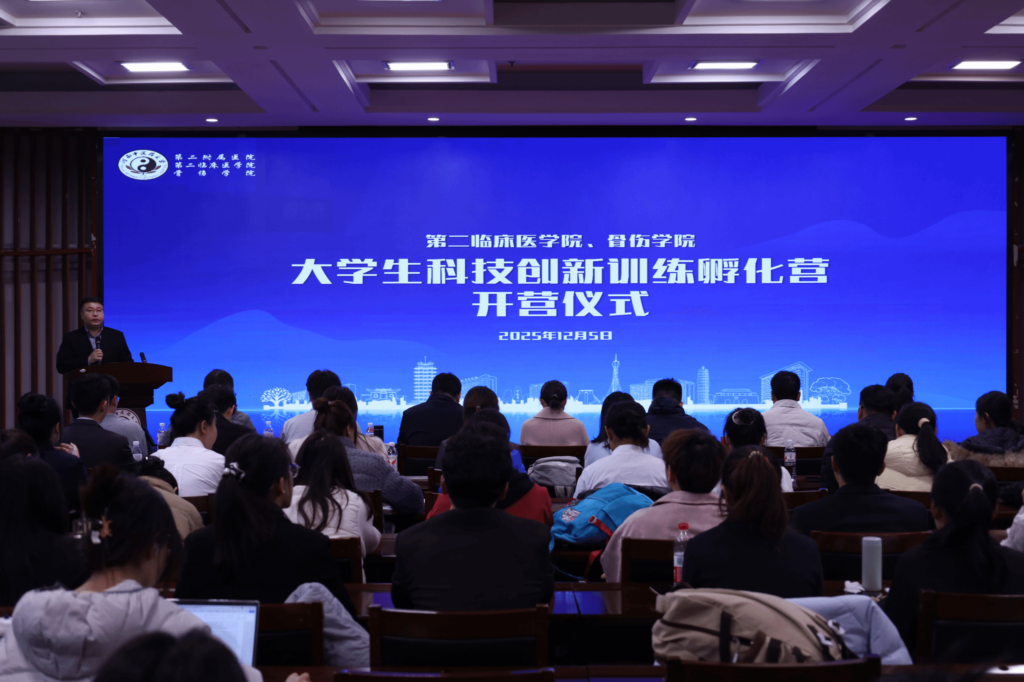 本网讯(文/乔利楠 图/李楠森)为深入贯彻落实创新驱动发展战略,提升医学生科技创新能力,培育高素质复合型医学人才,第二临床医学院、骨伤学院于2025年12月5日在龙子湖校区图书馆第二报告厅举行大学生科技创新训练孵化营开营仪式。校团委副书记郭薇、学院党委副书记陈戈参加,校团委、校就业创业指导中心等有关工作负责人、学院孵化营导师代表及师生代表共同参与。