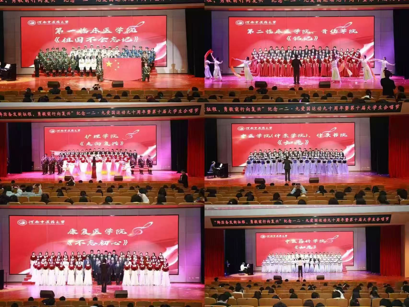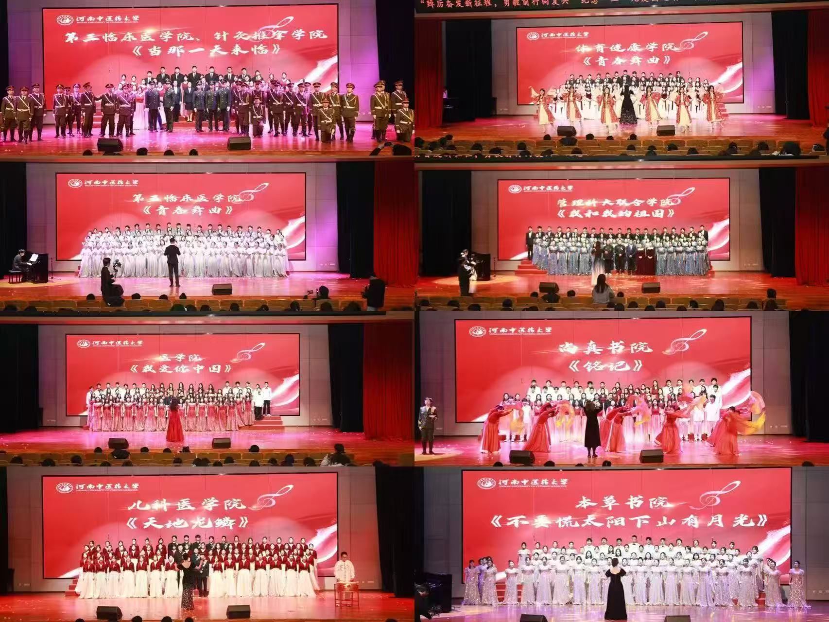 本草书院以一曲《不要慌太阳下山有月光》,用温柔坚定的声音传递出从容前行的力量;体育健康学院与第五临床医学院分别献上《青春舞曲》,或洋溢对生活的热爱,或迸发蓬勃的青春朝气;尚真书院与第二临床医学院、骨伤学院以不同风格演绎《铭记》,共同表达对初心与历史的敬畏;第一临床医学院的《祖国不会忘记》铿锵激荡,尽显对祖国的赤子深情;儿科医学院《天地龙鳞》大气恢宏,唱出对中华文化的自信传承;第三临床医学院、针灸推拿学院以热血昂扬的《当那一天来临》点燃全场;管理科大联合学院深情唱响《我和我的祖国》,悠扬旋律动人肺腑;医学院以嘹亮歌声诠释《我爱你中国》,传递深切赞美;中医学院(仲景学院)、仲景书院与康复医学院分别带来《如愿》与《不忘初心》,于温柔中寄托美好愿景;护理学院则以一曲激昂的《走向复兴》,展现奋进的决心。各学院精心打磨、真诚演绎,赢得阵阵掌声。最终,合唱节在大学生艺术团《思念》的优美旋律中圆满落幕。经过激烈角逐,最终第一临床医学院的《祖国不会忘记》、第二临床医学院、骨伤学院的《铭记》、护理学院的《走向复兴》等曲目获得一等奖,中医书院(仲景学院)、仲景书院程琦同学获得“最佳指挥”奖。