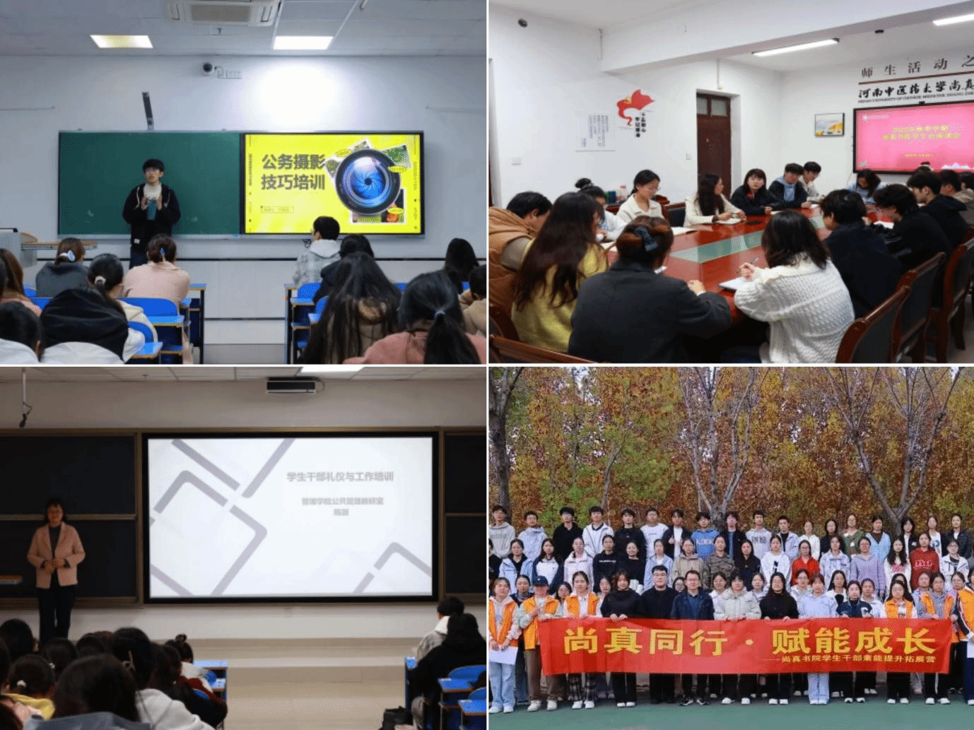 锤炼业务技能,夯实履职硬功。聚焦学生骨干岗位核心需求,精准开设3场针对性技能培训,补齐业务短板。10月25日的摄影技能培训上,校新媒体骨干成员从相机硬件基础与公务拍摄实战两方面入手,既拆解了曝光三要素、构图技巧等理论知识,又梳理了各类场景的拍摄规范。10月28日晚,管理学院陈颖老师带来的礼仪与规范培训,明确了学生骨干“服务、桥梁、榜样”的三位一体定位,细化了“凡事有交代,件件有着落”的工作准则,还传授了文件管理、沟通礼仪等实务技巧。11月18日,黄宁宇、杨文君两位老师直击新闻文讯撰写、推文制作、策划书打磨等工作难点,将抽象理论转化为可落地的操作方法,全方位提升了骨干的业务实操能力。
