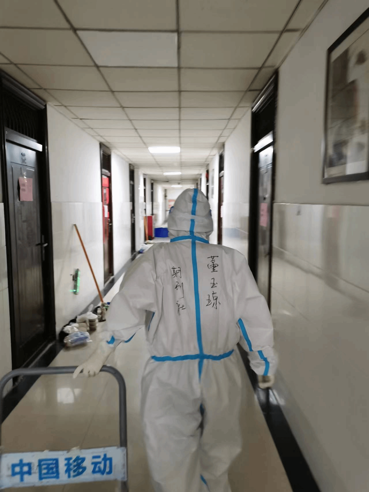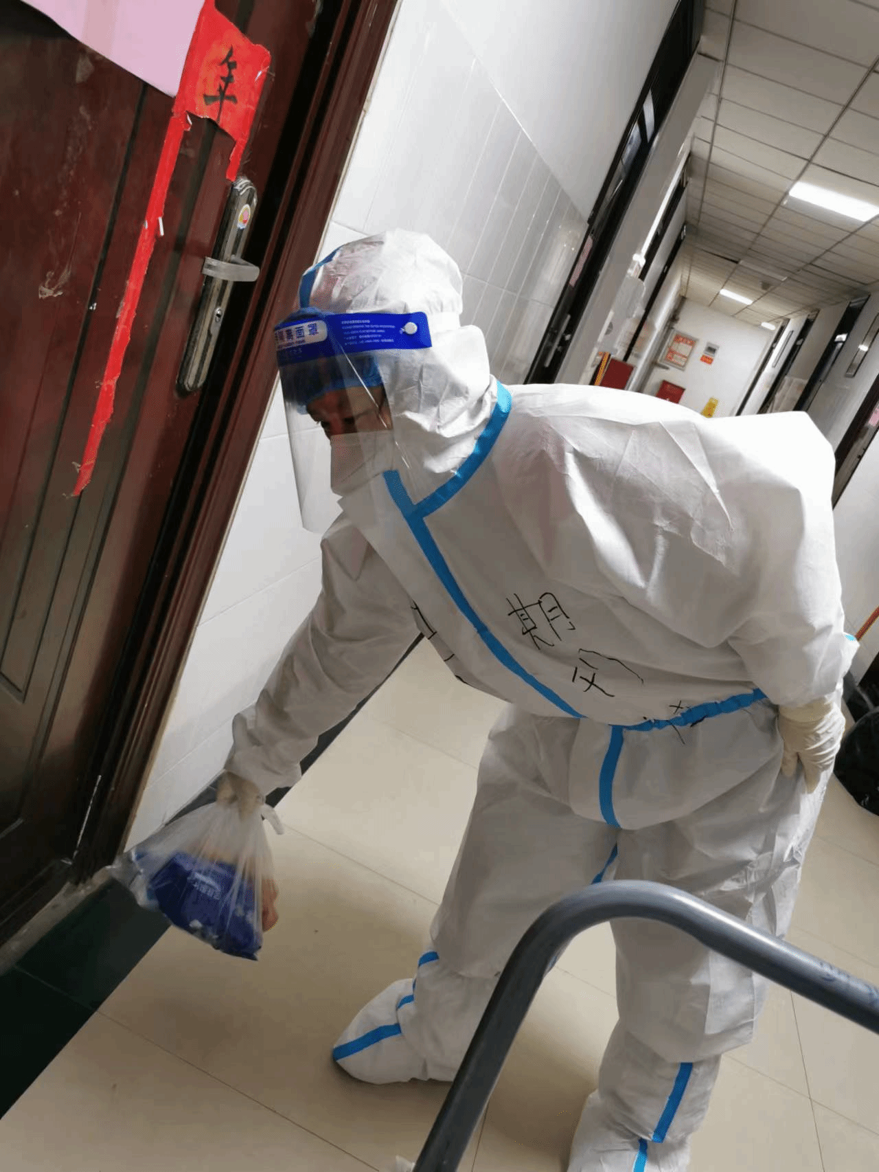 入校后,根据学校党委组织部的安排,董玉琼参与5号学生宿舍楼的送餐、分餐、收垃圾工作。送、分餐及收垃圾需要穿戴防护服往返楼于楼层之间,运动量极大,每次为学生送完饭脱下防护服都是满身大汗。在校期间董玉琼一人住宿在图书馆期刊社办公室,克服种种生活上的困难坚守在防疫工作前沿。