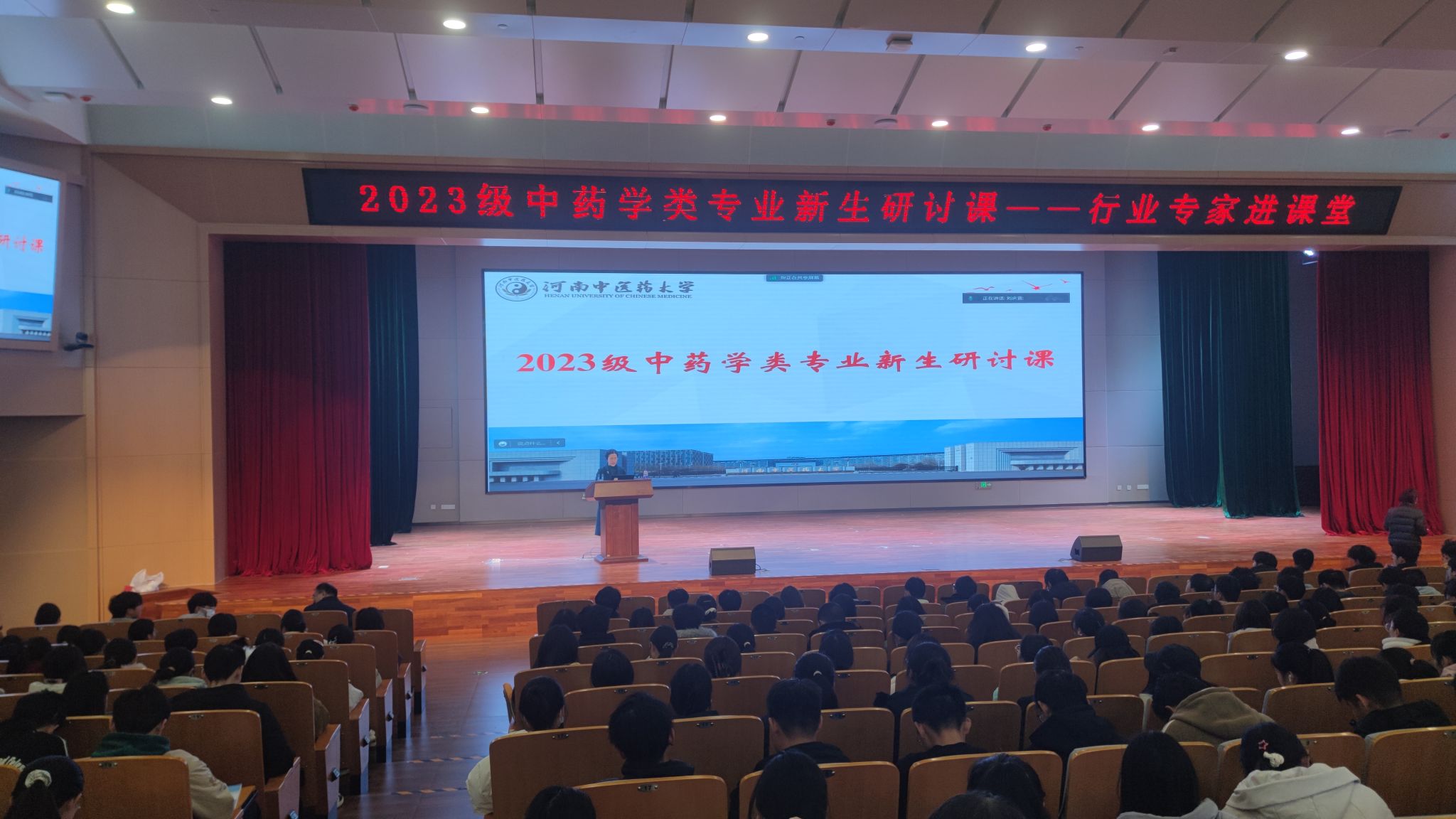 本网讯(文/刘庆普 图/张靖柯)为使学生更加了解专业和行业的发展,更加坚定专业自信心和自豪感,2023年11月25日,药学院(河南省中药制药技术与装备行业学院、现代中药产业学院)邀请知名校友仲景宛西制药股份有限公司副总经理高松、河南省药品医疗器械检验院副院长王海波走进课堂,在俊学楼B101会议室为近600名2023级中药学类专业学生带来了一场别样的新生研讨课,研讨课由药学院教学办公室主任朱鑫主持。